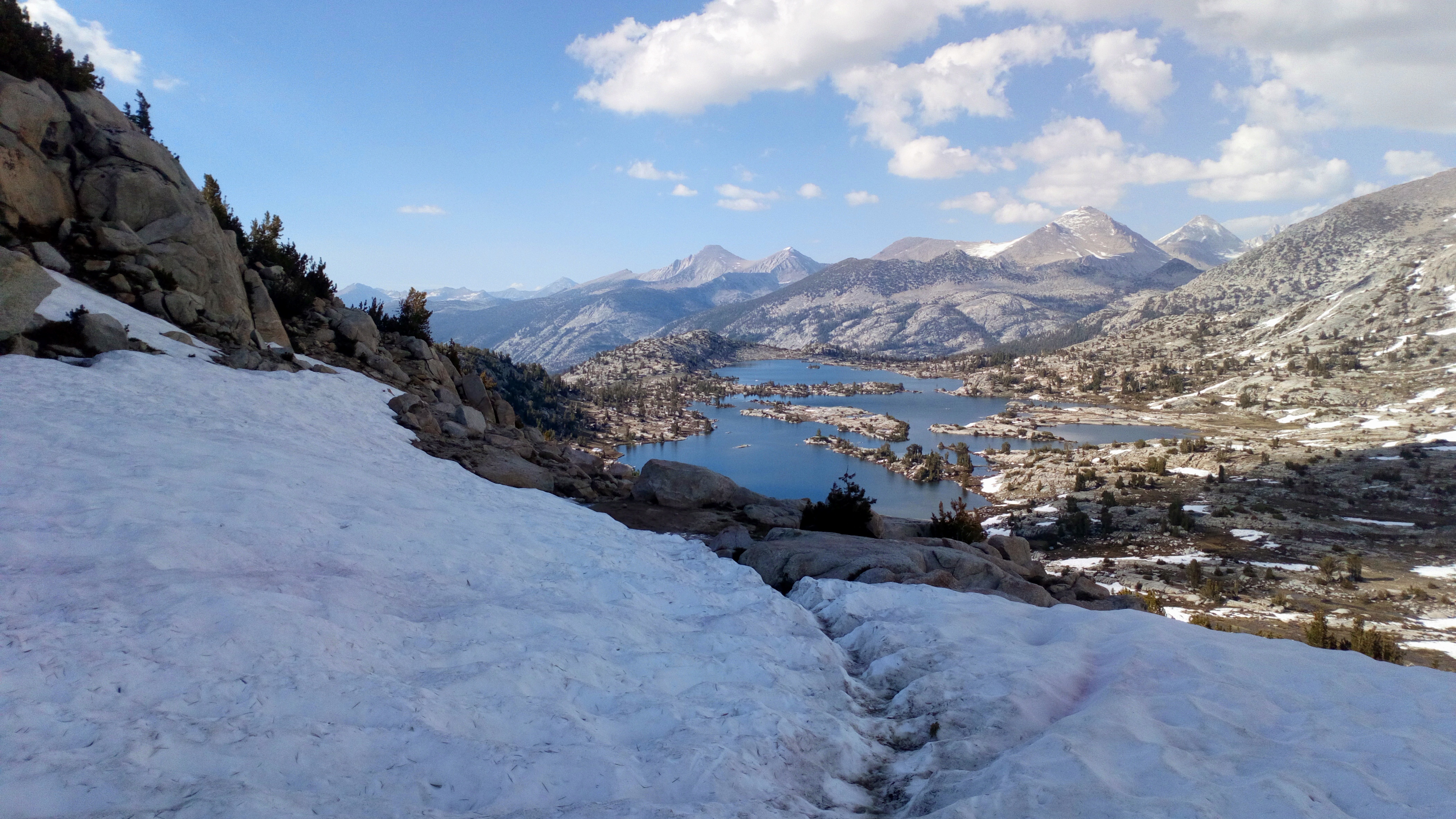 I coasted downhill the rest of the day and got as close as i could to Muir Pass. It wasn’t close enough. I reached the snowy section at around 11 and immediately lost the trail. I ended up finding my own trail for quite a while, switchbacking up snowy slopes and eyeballing logical routes before i saw the pass in the distance. I hit the top of the pass at around 1 and started the slow trudge down the far side. The postholes were pre-made but i was still dunking my feet into ice cold melted snow in the bottom of them. After an hour of that i took a break on a boulder in the middle of the ocean to let my feet regain feeling and also have a little ‘this is insane what am i even doing’ moment. I hadn’t seen another person all day, and there i was on a boulder in a sea of pure white eating a Kit Kat and a tortilla somewhere in the mountains.